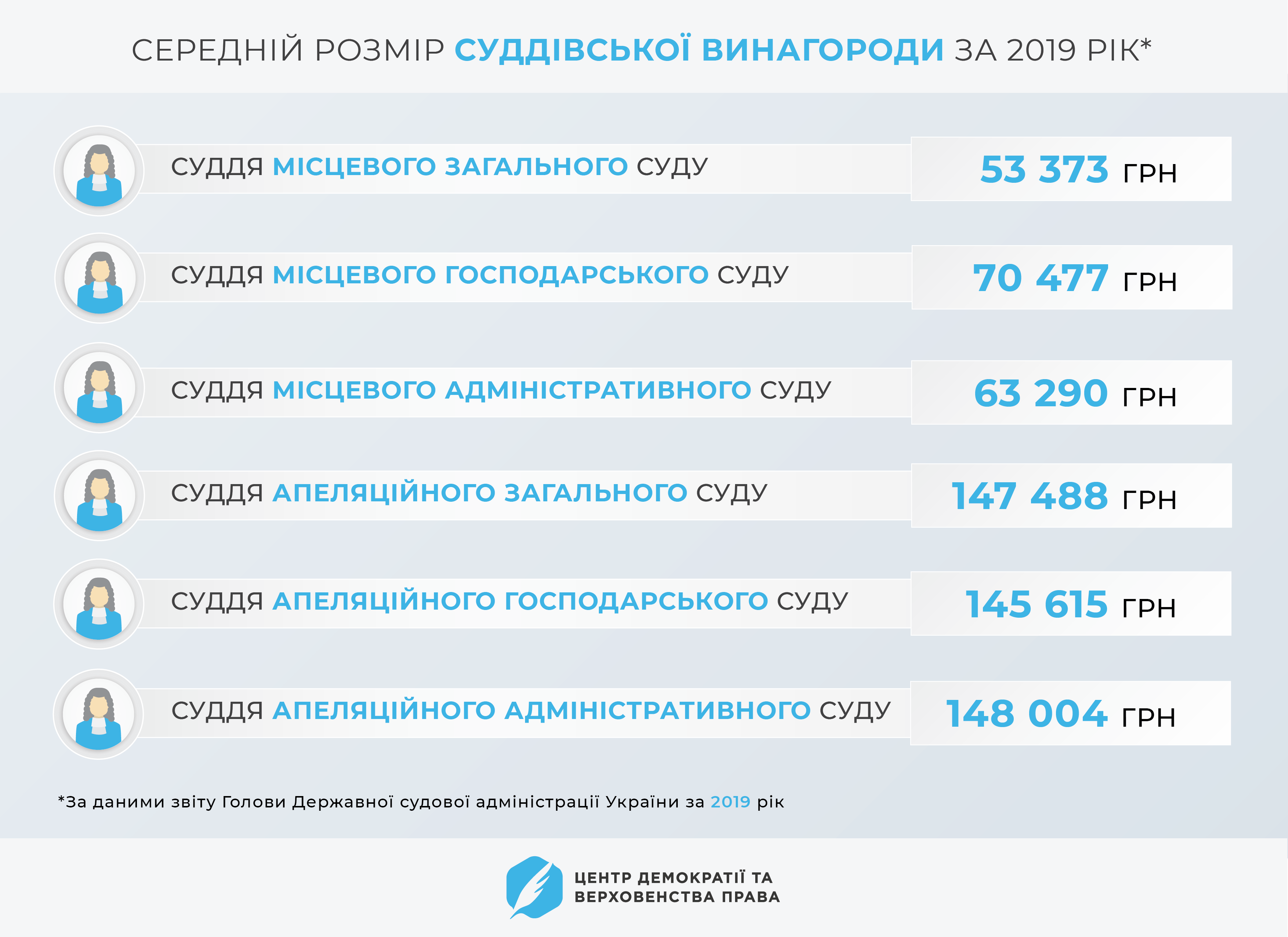 У 2019 році середня заробітна плата в Україні становила 10 497 грн. Таким чином, заробітні плати суддів першої інстанції майже у 5-7 разів більші, а суддів апеляційної інстанції – майже у 14 разів більші, ніж середні заробітні плати в державі.