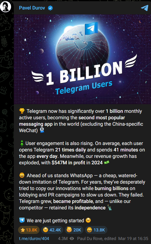 Скриншот. Загальна кількість користувачів Telegram (станом на березень 2025 року)