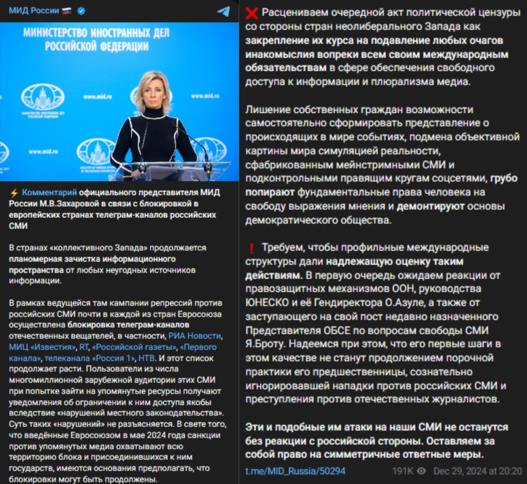 • Telegram-канали дипломатичних структур РФ. Посольства та офіційні акаунти дипломатичних представництв РФ поширюють контент підсанкційних ресурсів. Дипломатичний статус забезпечує легальне прикриття і робить блокування таких каналів складнішим. Крім того, такий контент адаптується під мову цільової аудиторії.