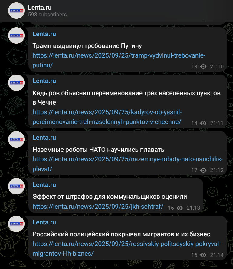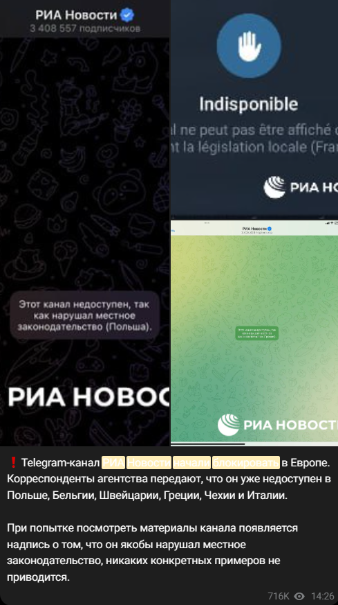 Характерною ілюстрацією цього є приклад на скриншоті, де було переслано публікацію з офіційного каналу РИА Новости. Якщо спробувати перейти безпосередньо на канал РИА Новости з цього каналу, він виявиться заблокованим. Проте сам контент далі вільно циркулює у мережі інших каналів у форматі forward.