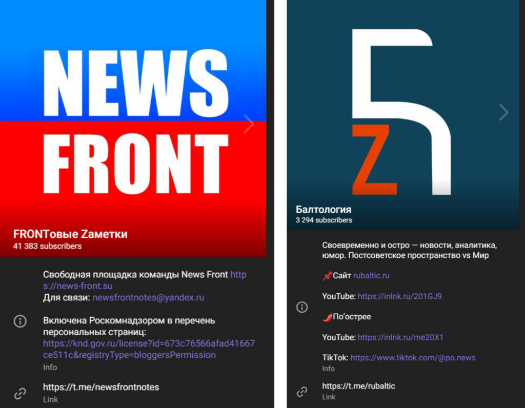 • Telegram-канали пропагандистів та представників «м’якої сили» РФ. Представники підсанкційних ресурсів (пропагандисти, засновники, «експерти») використовують персональні або афілійовані Telegram-канали для ретрансляції забороненого контенту.