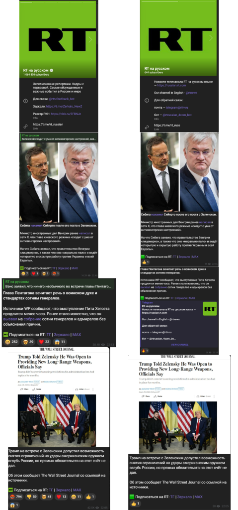 Тож внутрішні проросійські актори та Telegram-канали відіграють важливу роль у транскордонному поширенні російської пропаганди, діючи як «мостик» для контенту підсанкційних ресурсів і забезпечуючи його доступність для локальної та закордонної аудиторії.