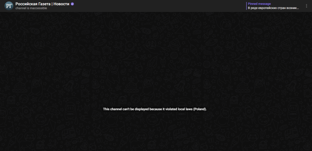 Розглянемо, як працює цей механізм на прикладі «Российской Газеты» — ресурсу заснованого Урядом РФ. Перевірка доступу показала, що Telegram-канал цього підсанкційного ресурсу заблокований на території ЄС. Сподіватимемося, що блокування здійснюється й інтернет-провайдерами відповідно до вимог санкцій. Але як у такому разі російськомовному контенту підсанкційного ресурсу дістатися до закордонної аудиторії?