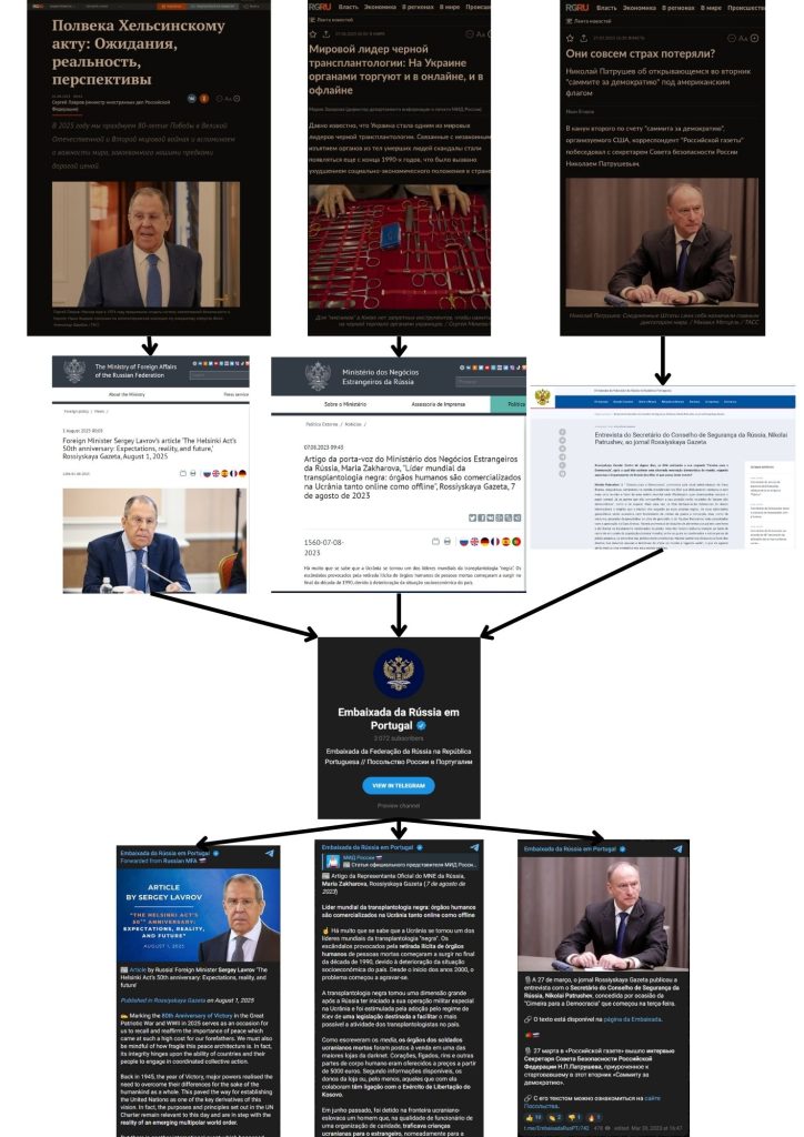 Наприклад, Telegram-канал Посольства Росії в Португалії (Embaixada da Rússia em Portugal) публікує короткий виклад інтерв’ю, здебільшого португальською, та додає посилання на переклад повного тексту на сайті МЗС РФ або на вебресурсі самого посольства. Таким чином зміст підсанкційного інтерв’ю стає доступним місцевій аудиторії, оминаючи технічні обмеження.