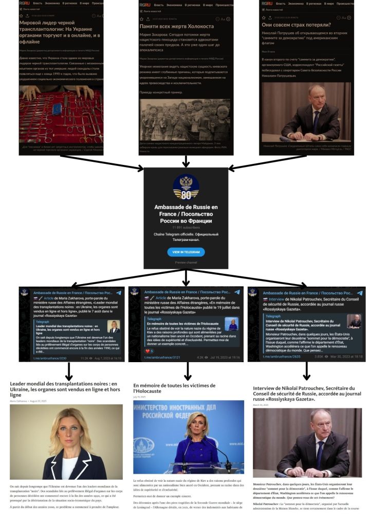 В більшості випадків схема виглядає так: високопосадовці РФ, наприклад, Сергій Лавров чи Марія Захарова, дають інтерв’ю або пишуть статтю, що публікується на «Российской газете». Цей ресурс має лише російськомовну версію сайту, доступ до якого в ЄС обмежений. Тоді офіційні дипломатичні ресурси, зокрема Telegram-канали посольств РФ, беруться за поширення цих матеріалів.