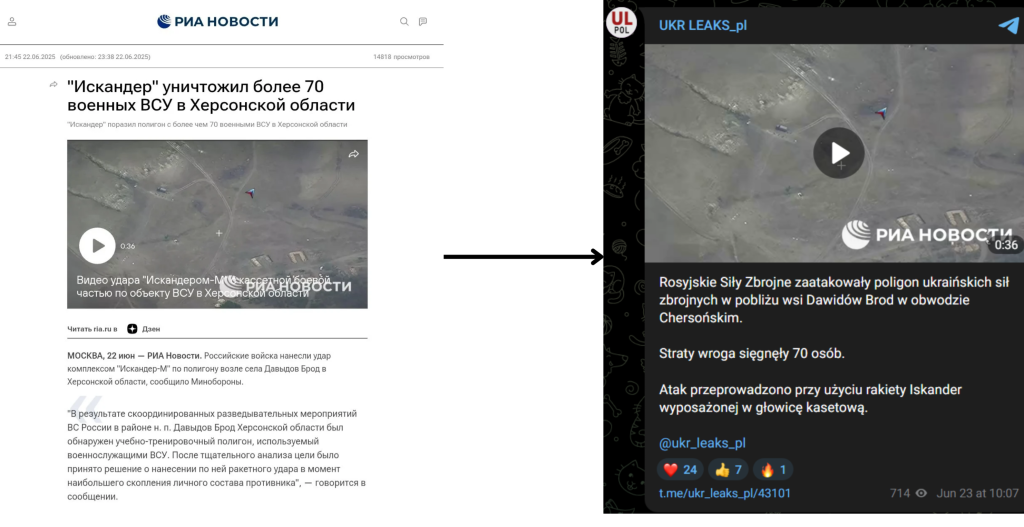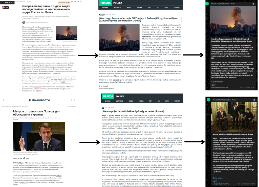 Наприклад, RIA Novosti чи Lenta.ru, які не мають польськомовних версій своїх сайтів, фактично отримують доступ до польської аудиторії через переклади та републікації у польськомовних Telegram-каналах. У подальшому такі повідомлення можуть активно підхоплюватися проросійськими користувачами чи екстремістськими групами й поширюватися вже на інших платформах із суттєво більшим охопленням.