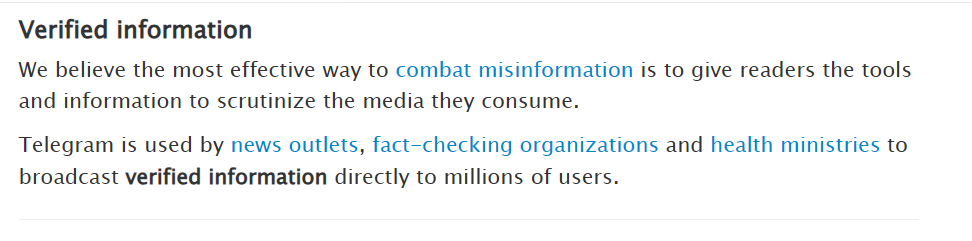 Як зазначено в офіційних поясненнях Telegram: «Найефективніший спосіб боротьби з дезінформацією — це надати користувачам інструменти та інформацію для ретельного аналізу медіа, які вони споживають». Фактично, за правилами Telegram, якщо на платформі зареєстровані акаунти надійних новинних агентств, організацій з перевірки фактів та міністерств, то користувачі автоматично отримують доступ до достовірної інформації.