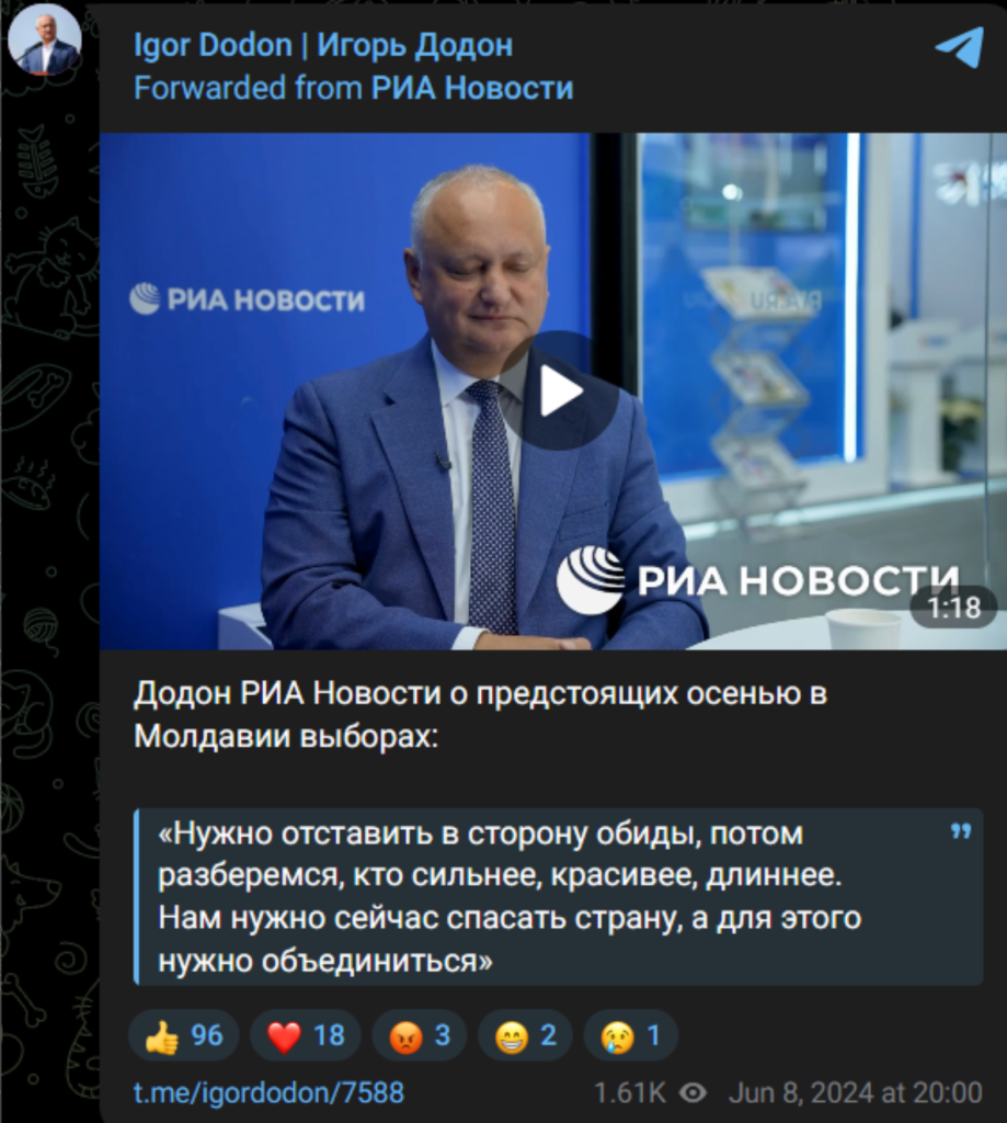 Приклади цього способу також включають поширення матеріалів через персональні канали проросійських політичних фігур. Так, колишній президент Молдови та проросійський лідер соціалістів Ігор Додон використовує власний Telegram-канал для поширення власних інтерв’ю для РИА Новости, таким чином поширюючи їхніх контент.