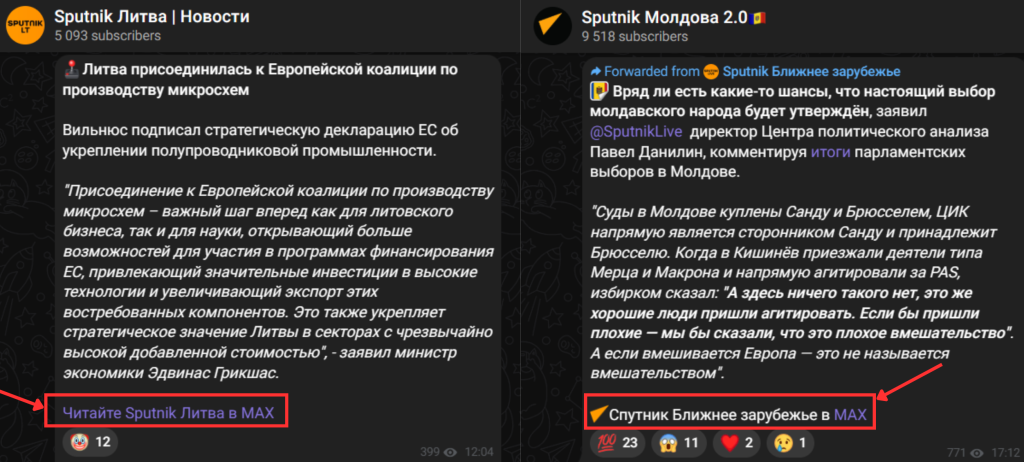 Аналізуючи Telegram-канали, ми помітили нову тенденцію, яка лише починає формуватися. Для російськомовного населення в інших країнах у регіональних Telegram-каналах Sputnik пропонують читати контент у Max — російському месенджері, випущеному компанією VK у 2025 році.