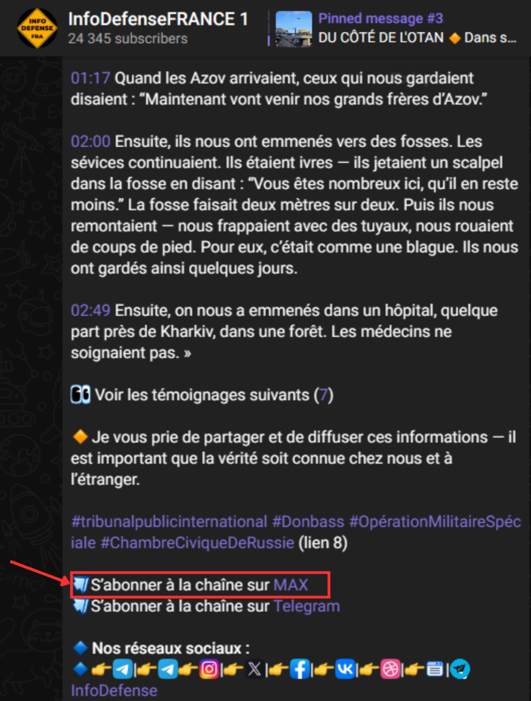 Також ми натрапили на схожі пропозиції підписуватися хоч і сторонні, але сторінки в Max з іншомовних Telegram-каналів. Зокрема, франкомовний Telegram-канал InfoDefence France 1 пропонує підписатися на сторінку одного з пропагандистів та учасника «СВО».