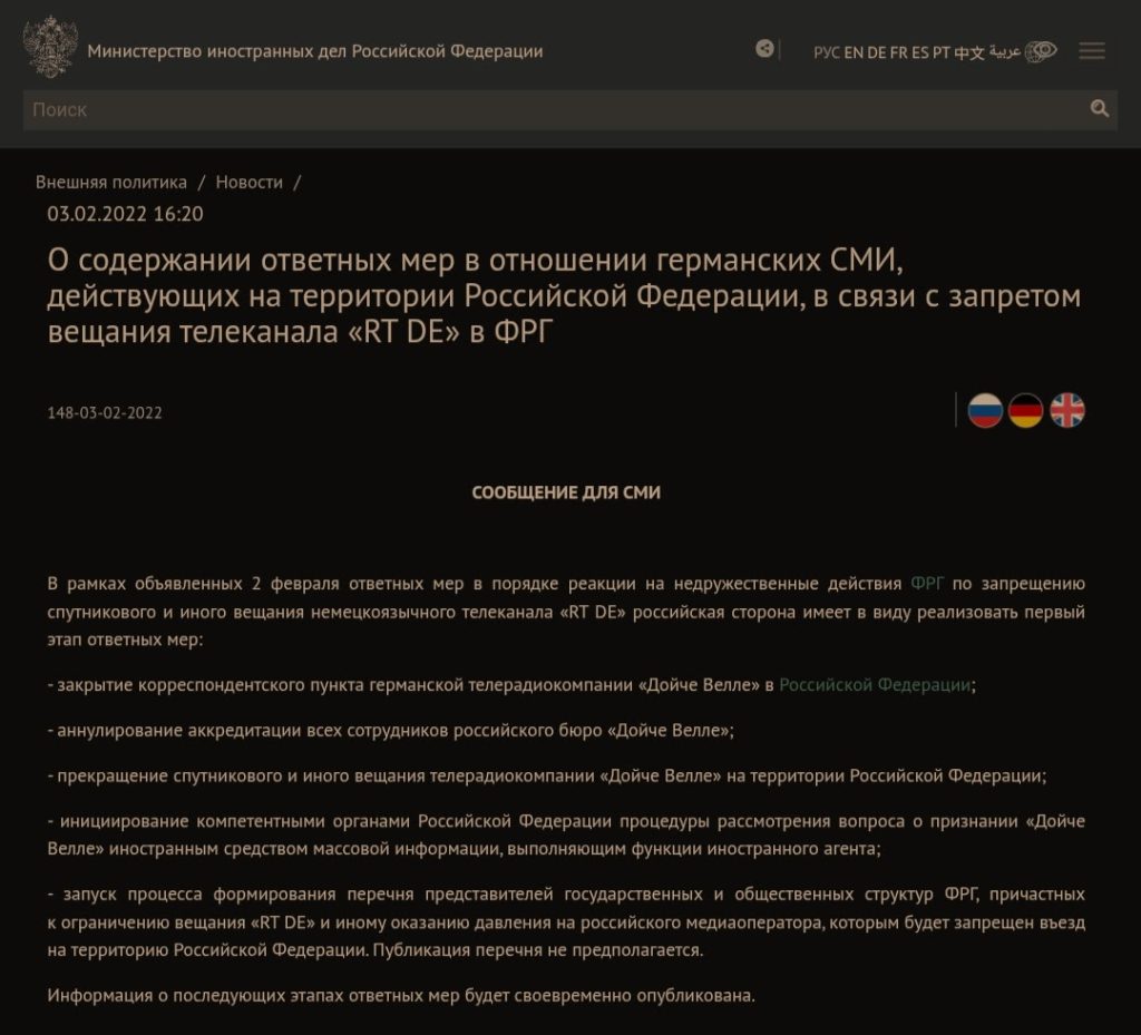 Наразі ЄС призупинив мовлення та анулював ліцензії 27 пропагандистських ресурсів, підтримуваних Кремлем, які використовуються для навмисного поширення пропаганди і проведення дезінформаційних кампаній, у тому числі й на території ЄС. Обмеження поширюються на всі засоби передачі і поширення інформації: кабельне та супутникове телебачення, інтернет-платформи, вебсайти та додатки.