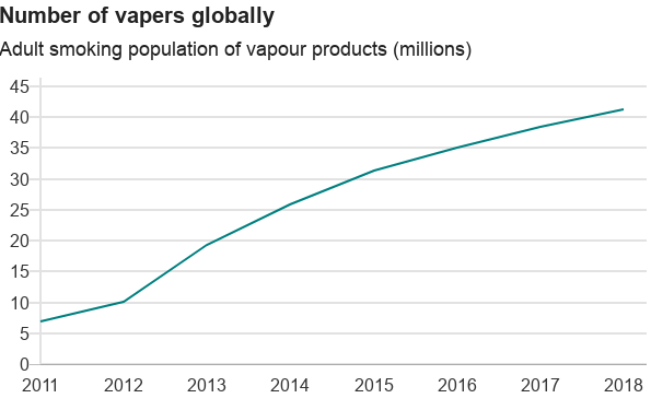 Із 2011 року кількість споживачів е-сигарет по всьому світу з 7 млн збільшилася до 41 млн у 2018 році. Дослідження компанії Euromonitor прогнозують до 2021 року зростання цього показника до 55 мільйонів людей. Прибутки від продажу цих тютюнових виробів сягають сотень мільйонів доларів.