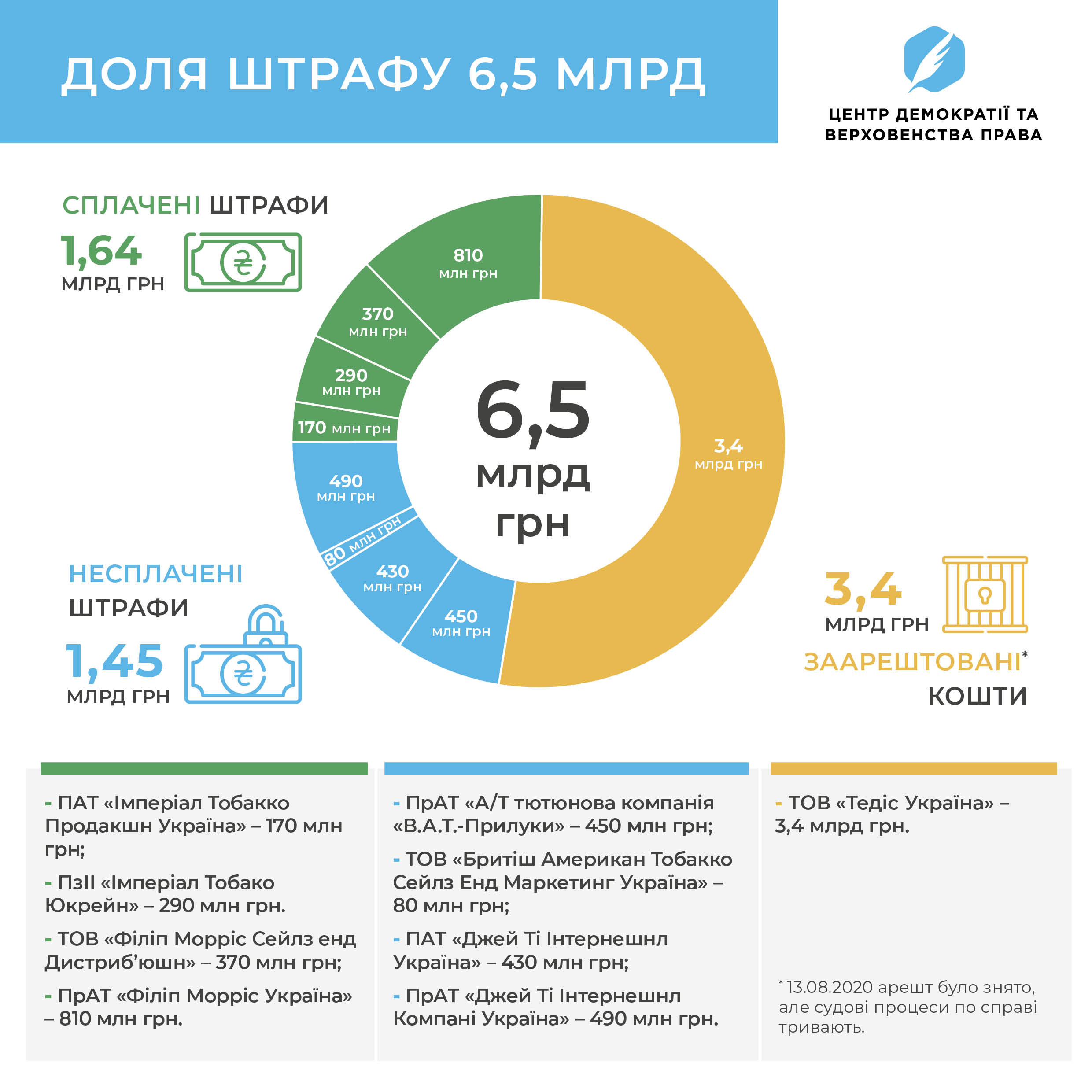 Але. Та сама суддя Господарського суду м.Києва, яка у липні арештувала рахунки Тедісу, 13 серпня 2020 року ухвалила нове рішення, яким скасувала арешт. В ухвалі зазначено, що арешт коштів ТОВ «Тедіс Україна» може привести до неможливості виконання зобов’язань підприємства з дистрибуції тютюнової продукції і, як наслідок, дефіциту легальних сигарет на полицях магазинів, а також до дестабілізації на тютюновому ринку України, втрат бюджетів і тд.