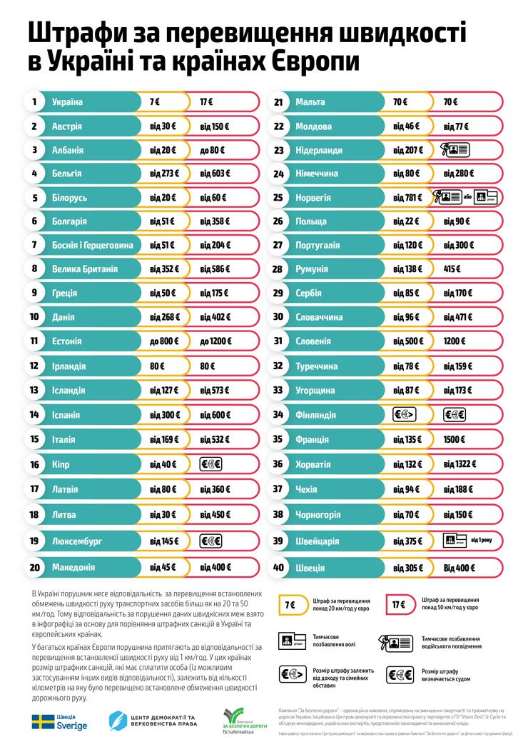 Окремої уваги заслуговує й те, що більшість проаналізованих в інфографіці країн Європи мають нульову толерантність до перевищення швидкості — штрафні санкції накладаються навіть за найменші порушення. Перевищивши швидкість на 1-20 км/год на території Іспанії, порушник отримає штраф у розмірі 100 євро. Такі жорсткі санкції є виправданими, адже, за даними ВООЗ, перевищення швидкості всього на 5 км/год в межах міста достатньо, аби підвищити вірогідність ДТП вдвічі.