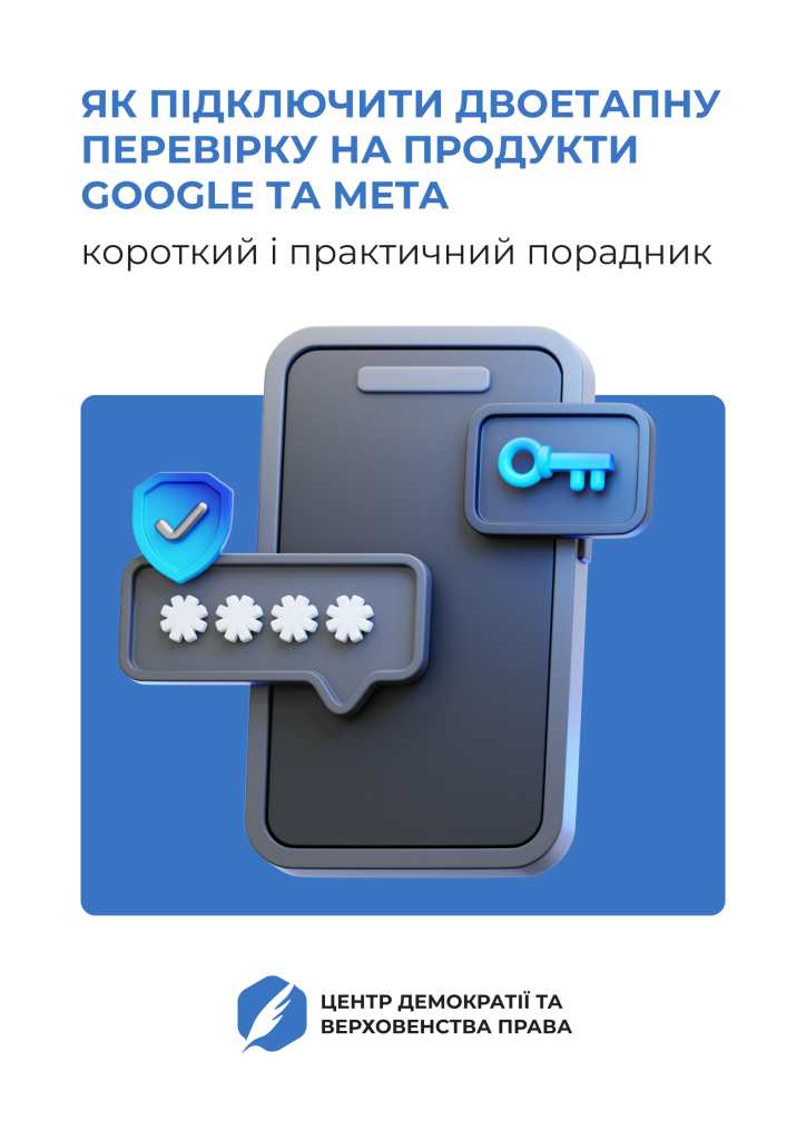 Тож Центр демократії та верховенства права підготував короткий і практичний порадник, який допоможе вам підключити двоетапну перевірку у продуктах Google та Meta і захистити себе. У ньому наведені алгоритми дій, скріншоти та пояснення, розраховані на широкий загал користувачів. Важливо зазначити, що усі дії у цій консультації виконувались на ноутбуці, але ви також можете це зробити за допомогою вашого смартфона, проте, деякі елементи, меню та інше можуть дещо відрізнятись.