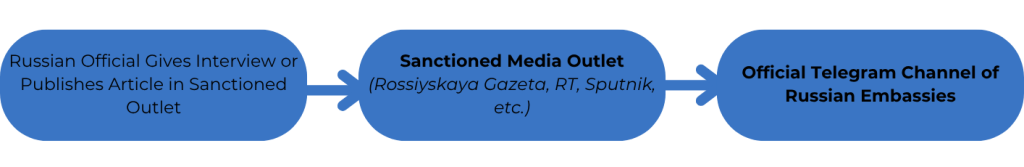 In most cases, the scheme looks like this: high-ranking Russian officials, such as Sergey Lavrov or Maria Zakharova, give an interview or write an article that is published in “Rossiyskaya Gazeta.” This resource has only a Russian-language version of the website, access to which is restricted in the EU. Then, official diplomatic resources, specifically the Telegram channels of Russian embassies, take on the task of disseminating these materials.