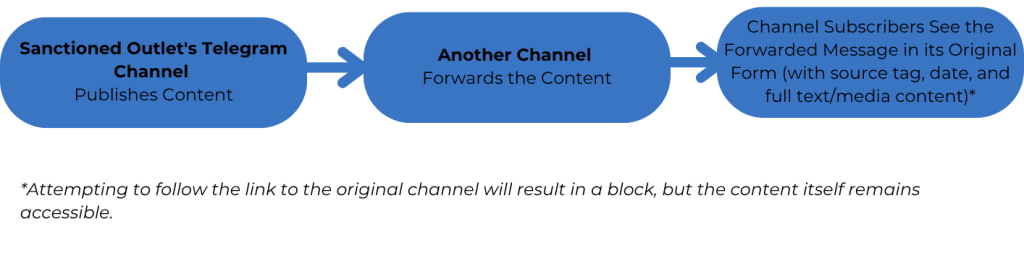 The forwarding function on Telegram essentially nullifies the effectiveness of channel blocking as a method of countering the dissemination of sanctioned content. Materials from such channels can freely reach the audience through other channels. This makes forwarded messages one of the simplest and, at the same time, most effective tools for bypassing sanctions within the platform.
