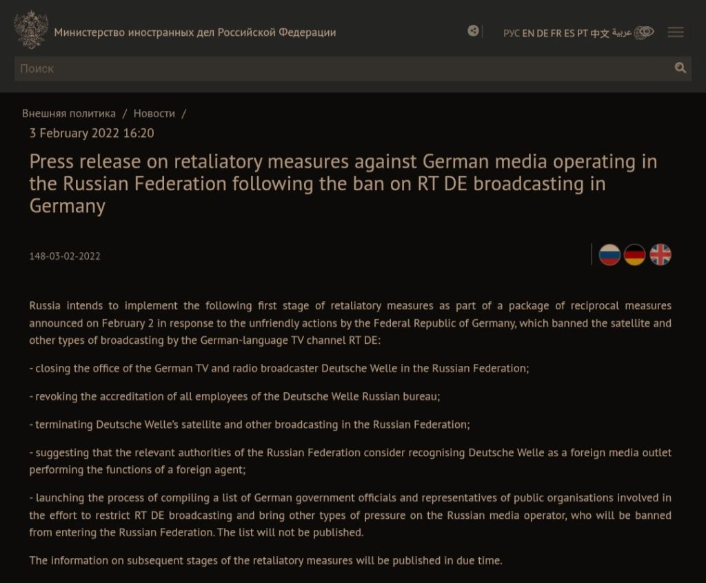 Screenshot. Russia’s corresponding measures against Deutsche Welle due to the ban on satellite and online broadcasts of RT DE in Germany