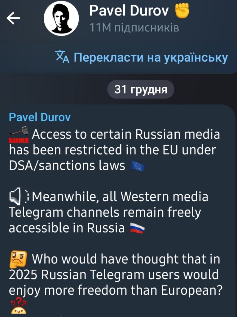 Screenshot. Pavel Durov’s reaction to the blocking of Telegram channels of sanctioned Russian propaganda resources in the EU