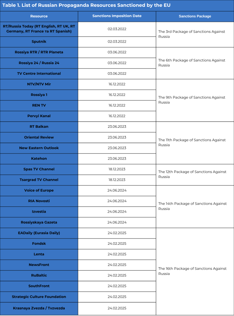 1. We compiled a list of Russian propaganda resources that were subjected to EU sanctions during the period 2022–2025.