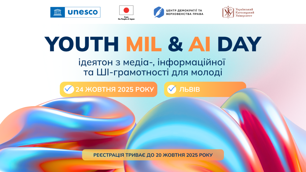 «Youth MIL and AI Day: ідеятон з медіа-, інформаційної та ШІ-грамотності для молоді» реалізовується Центром демократії та верховенства права у співпраці з Українським Католицьким університетом в межах проєкту «Посилення медіа- та інформаційної грамотності і навичок у сфері штучного інтелекту для підвищення стійкості України» у партнерстві з ЮНЕСКО та за підтримки Японії. Проєкт є частиною ширших зусиль ЮНЕСКО щодо підтримки безпеки журналістів і свободи слова в Україні.