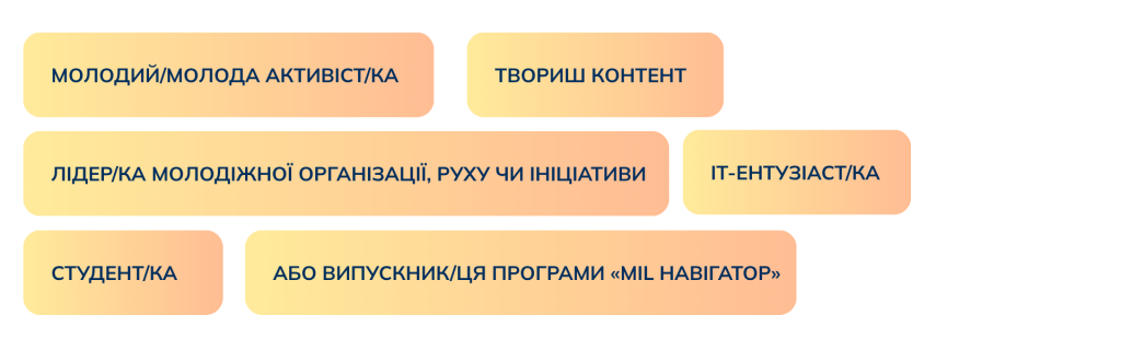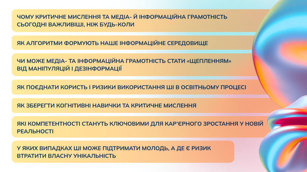 Для учасників заходу передбачена нетворкінгова фасилітаційна сесія, де вони обміняються думками й досвідом, сформують спільне бачення викликів та можливостей MIL в епоху штучного інтелекту. І найголовніше – збережуть контакти молодіжних лідерів, активістів, творців контенту, студентів з усіх куточків України задля спільної роботи над кращим майбутнім молоді.