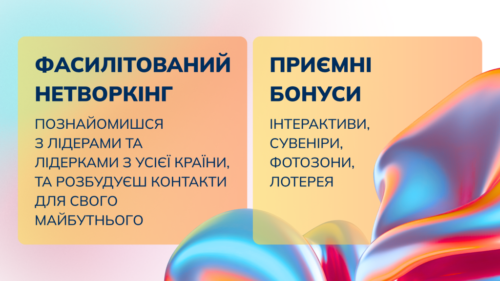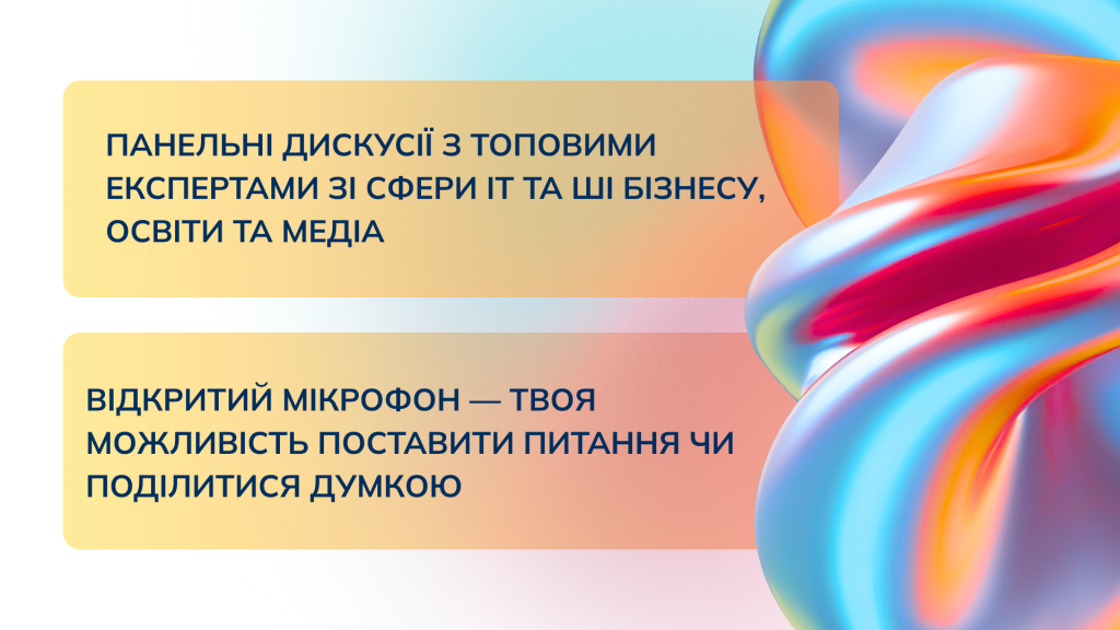 Окрім змістовних панелей, обговорень і нетворкінгу, ми підготували багато приємних бонусів: пам’ятні сувеніри, інтерактивні опитування та лотереї, тематичні фотозони й найголовніше можливість познайомитись з молодіжними лідерами в сфері АІ простір для обміну контактами.