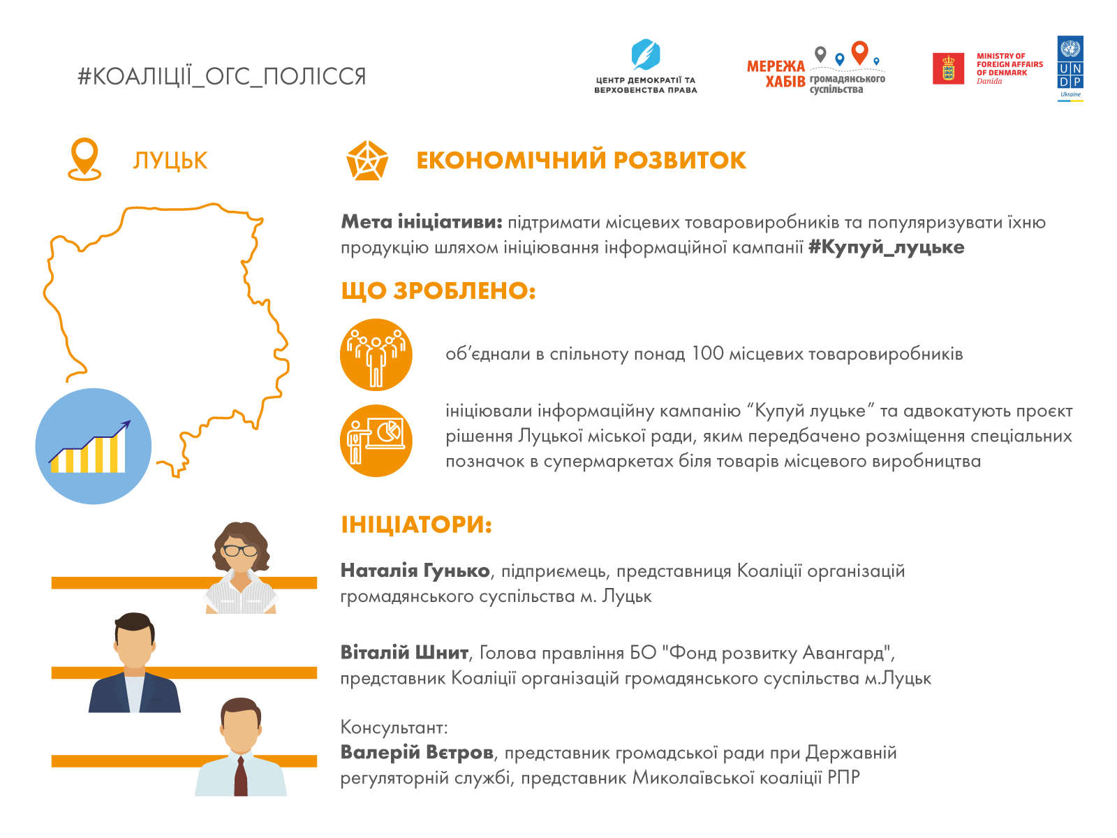 Представники коаліції, що переймаються темою економічного потенціалу міста ініціювали запуск інформаційної кампанії #Купуй_луцьке з метою інформування громади про місцевих товаровиробників та їх популяризації. Активісти створили групу в фейсбуці, що об’єднала понад 150 прихильників такої ініціативи. Також було розроблено проєкт рішення для міської влади який передбачає розміщення інформаційних позначок у торговельних мережах біля товарів місцевого виробництва. Ініціатори інформаційної кампанії провели ряд зустрічей з представниками міської влади під час яких було досягнуто домовленість про підтримку даної ініціативи з боку влади.