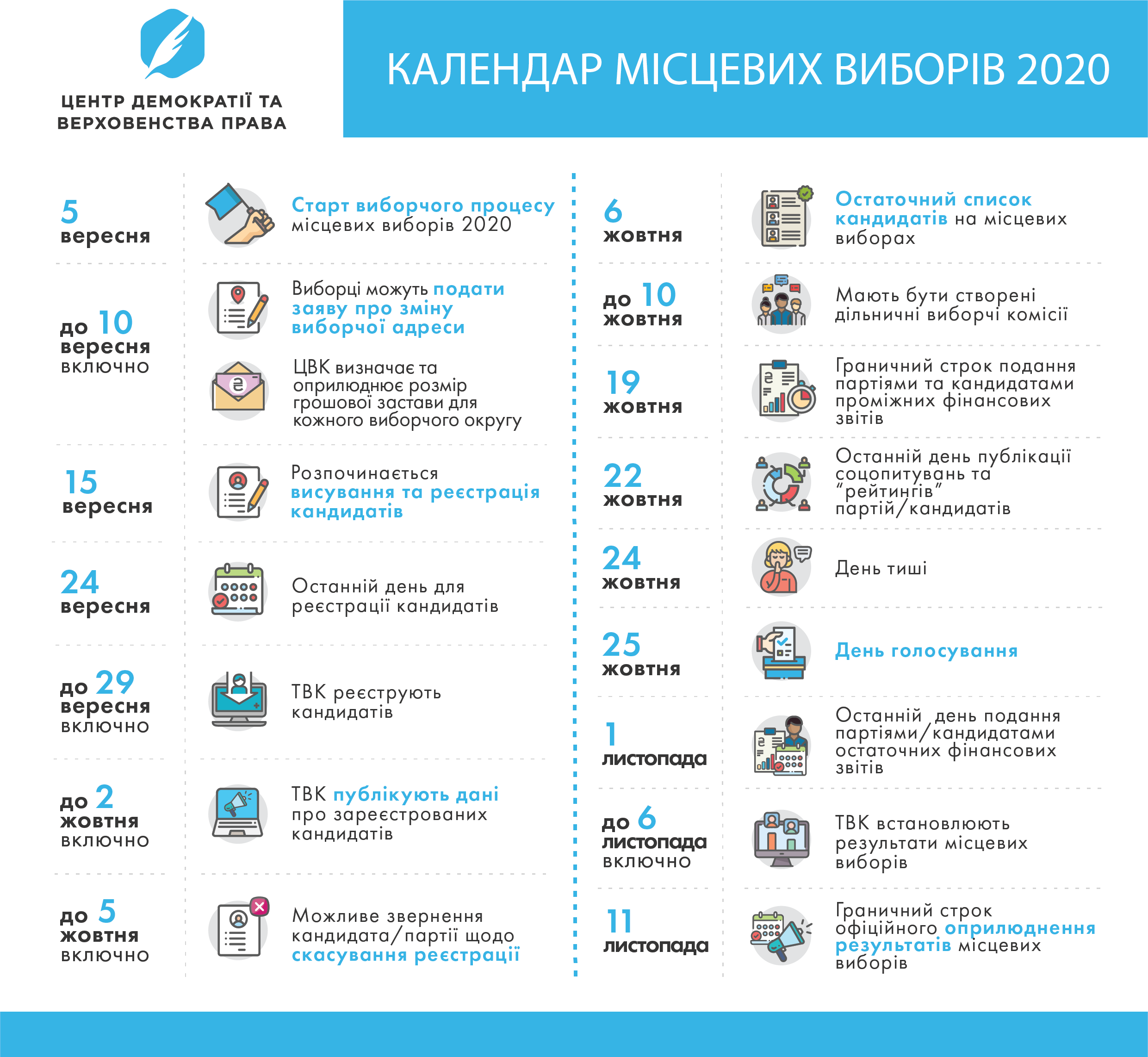 Не зважаючи на те, що фактично виборча гонка вже розпочалась, офіційно виборчий процес місцевих виборів стартує вже завтра — 5 вересня. ЦЕДЕМ підготував календар місцевих виборів, який допоможе розібратися з ключовими подіями виборчого процесу 2020.
