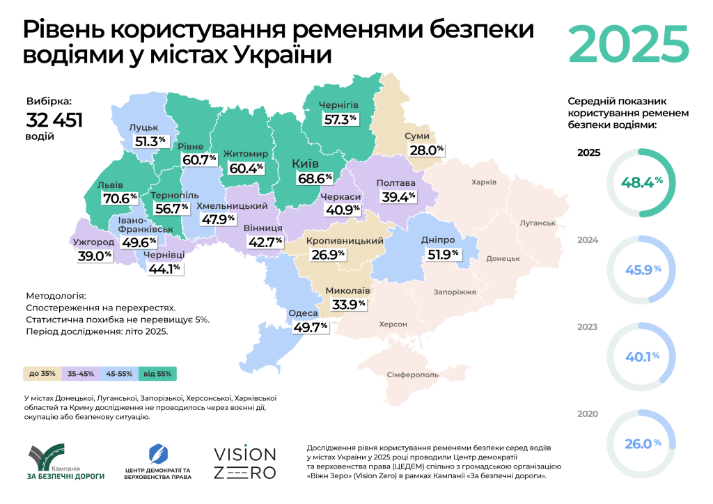 Дослідження “Рівень користування ременями безпеки серед водіїв у містах України” у 2025 році проводилось спільно громадськими організаціями “Vision Zero” (ГО “Віжн Зеро”) та Центром демократії та верховенства права (ЦЕДЕМ) в рамках Кампанії “За безпечні дороги”