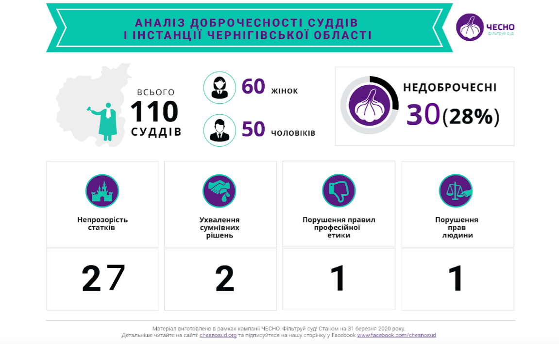 28% суддів першої інстанції у Чернігівській області є недоброчесними. Такі результати аналізу кампанії ЧЕСНО. Фільтруй суд!, презентованого 11 червня 2020 року. За даними ЧЕСНО, ці судді порушили щонайменше один критерій доброчесності, тобто виносили сумнівні рішення, мають непрозорі статки, причетні до кримінальних правопорушень чи корупції, не дотрималися норм професійної етики або ж порушували права людини.