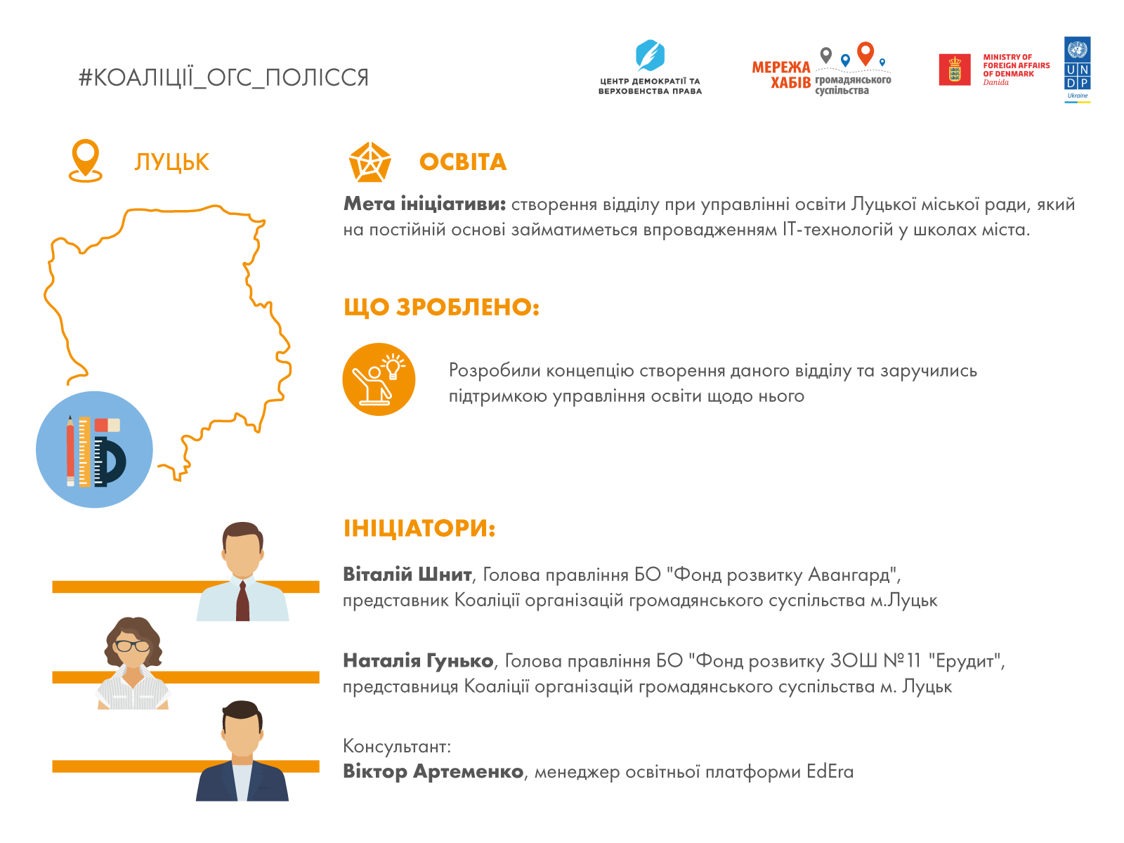 Представники освітнього напрямку Коаліції ОГС Луцька розробили концепцію створення відділу ІТ-технологій при управлінні освіти Луцької міської ради та провели ряд зустрічей з представниками міської влади. За результатами цих зустрічей досягнута домовленість про те, що вже з 1 вересня цього року будуть найняті відповідні фахівці, які впроваджуватимуть сучасні технології в освітній процес шкіл міста.